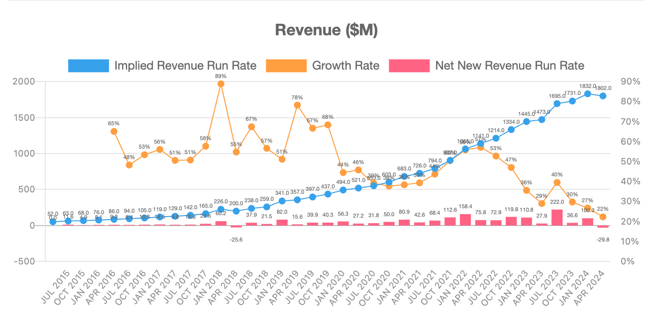 If we look at an individual company like MongoDB, we see data that’s playing out across the SaaS landscape (see latest Clouded Judgement article). Companies are still growing quickly, but that growth is slowing.