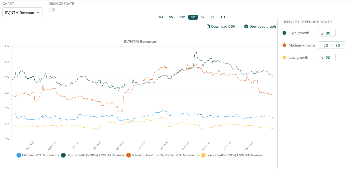 With Public Comps, we can look at industry comps or individual company comps. Using the BVP Cloud 100 as an example, we can see data like FCF, EV/EBITDA, and EV/NTM over time: