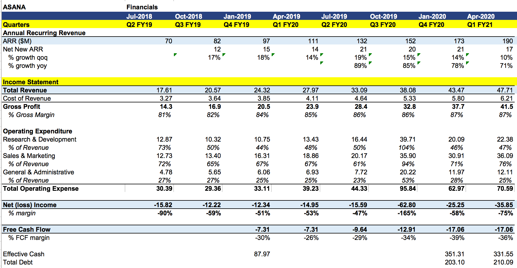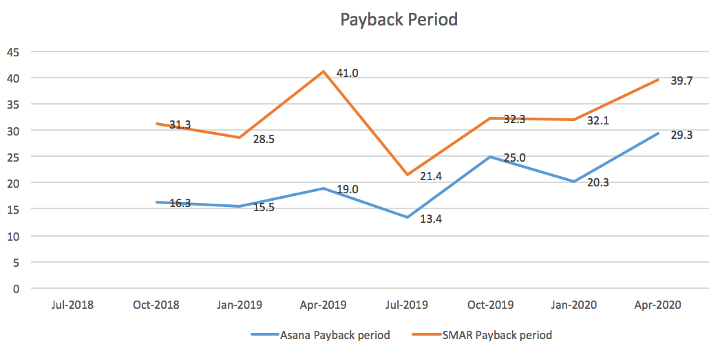 - Top-line growth and churn are heavily impacted by COVID-19: there were 38 mentions of COVID-19 in Asana's S-1, as they raised execution, sales, and expansion risks associated with the pandemic. As seen in other companies' earnings calls, SMB sales were most impacted and many deals are being pushed out to future quarters as sales cycles have lengthened.