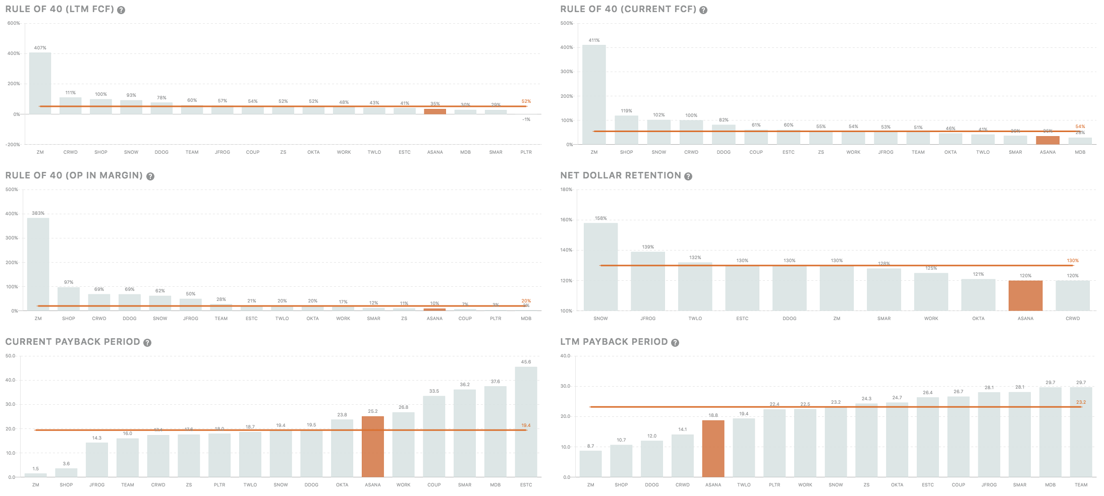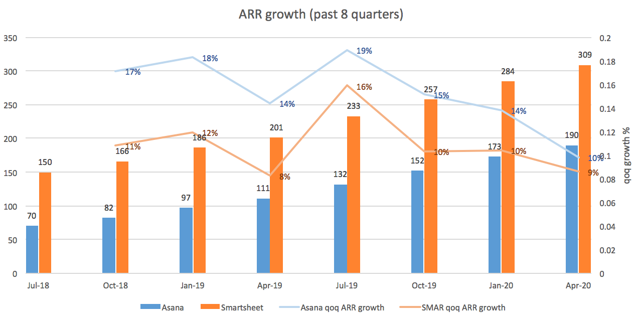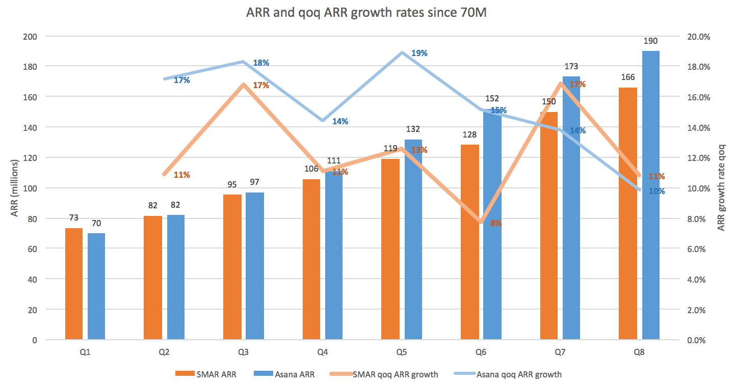 Asana reported a net dollar retention of 120%, while Smartsheet reported net dollar retention of 128%. Its worth noting that workplace collaboration software that cater towards enterprise such as SMAR, have higher potential for "land and expand" and thus naturally have higher net dollar retention rates from expansion within existing customers.