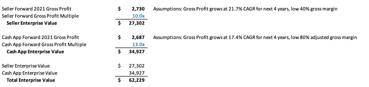 Block's current equity value is ~$66B which suggests that Block's core Seller and Cash App ecosystem without Afterpay synergies and gross profit account for 90%+ of equity value depending on multiples attached to each ecosystem. Even if you attach lower multiples on both Seller and Cash App, Block's equity value attributes minimal value to Afterpay, a business growing at a significantly quicker clip while also reaccelerating aspects of both the Seller and Cash App businesses.