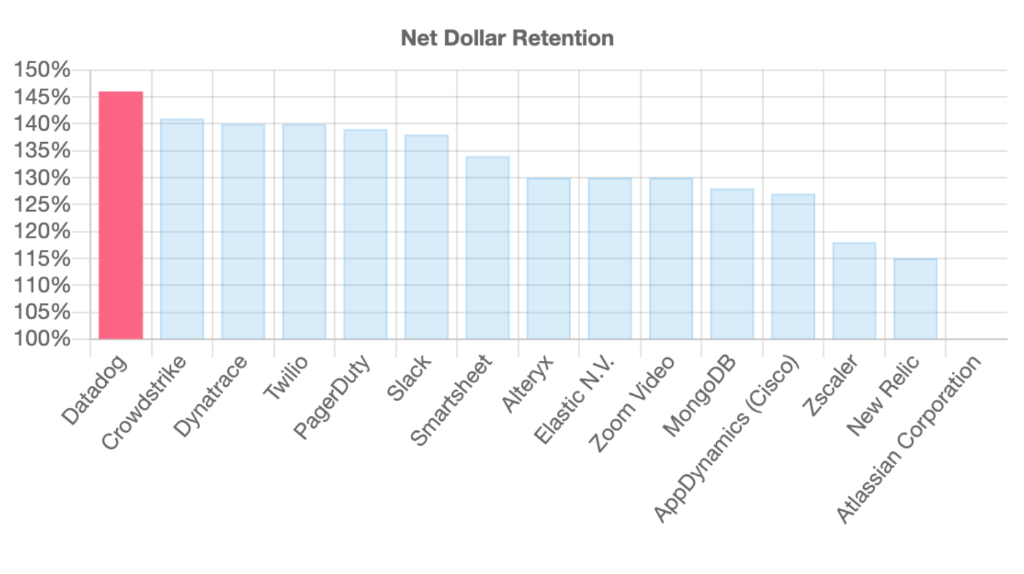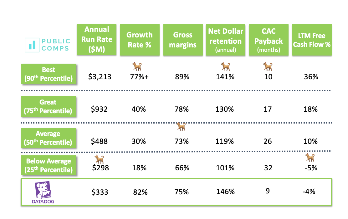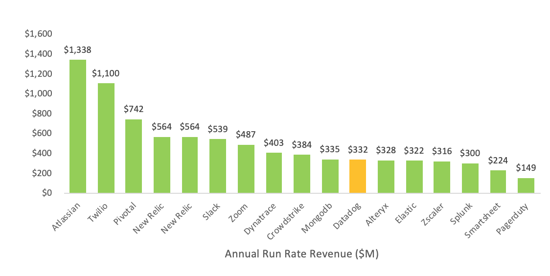 Revenue: At $332m ARR, Datadog is definitely on the smaller side relative to all Public SaaS companies (e.g Salesforce is $16b annual revenue run rate) but DDOG in the same $300–500m ARR range as other high growth SaaS companies like Crowdstrike, Zoom, Elastic, Alteryx, MongoDb.