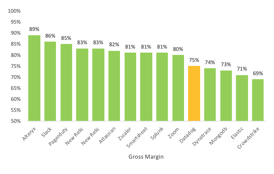 Gross Margin: Datadog has slightly lower gross margins than the typical SaaS company because of the cost of having to pay 3rd party cloud vendors to store all the data that they capture on behalf of their customers.