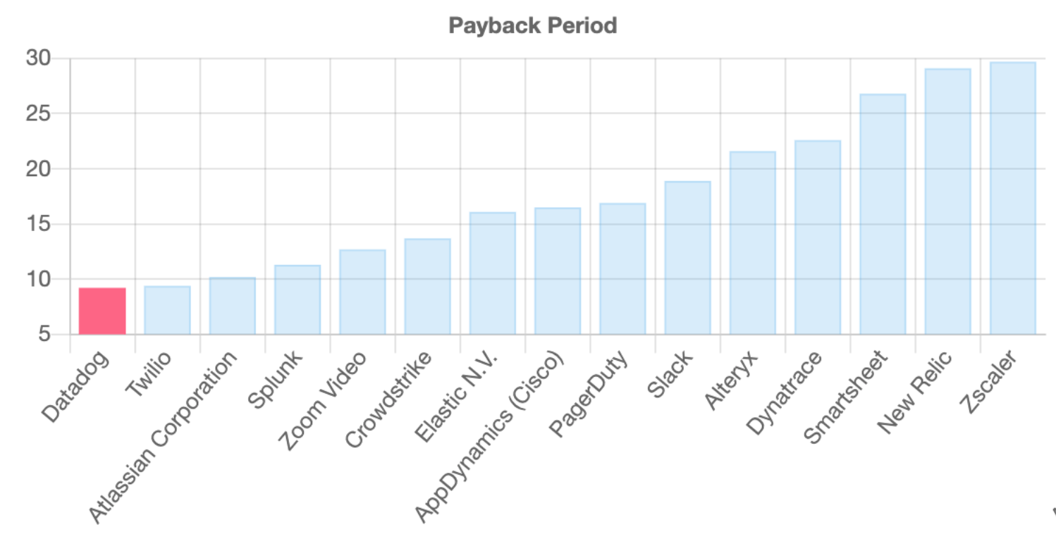 Payback Period: Datadog has the lowest payback period (9 months) driven by the self-service model and high-velocity sales motion. And the most recent payback period wasn’t just an anomaly: if you take the median payback period in the last 8 quarters, it’s roughly 10 months.