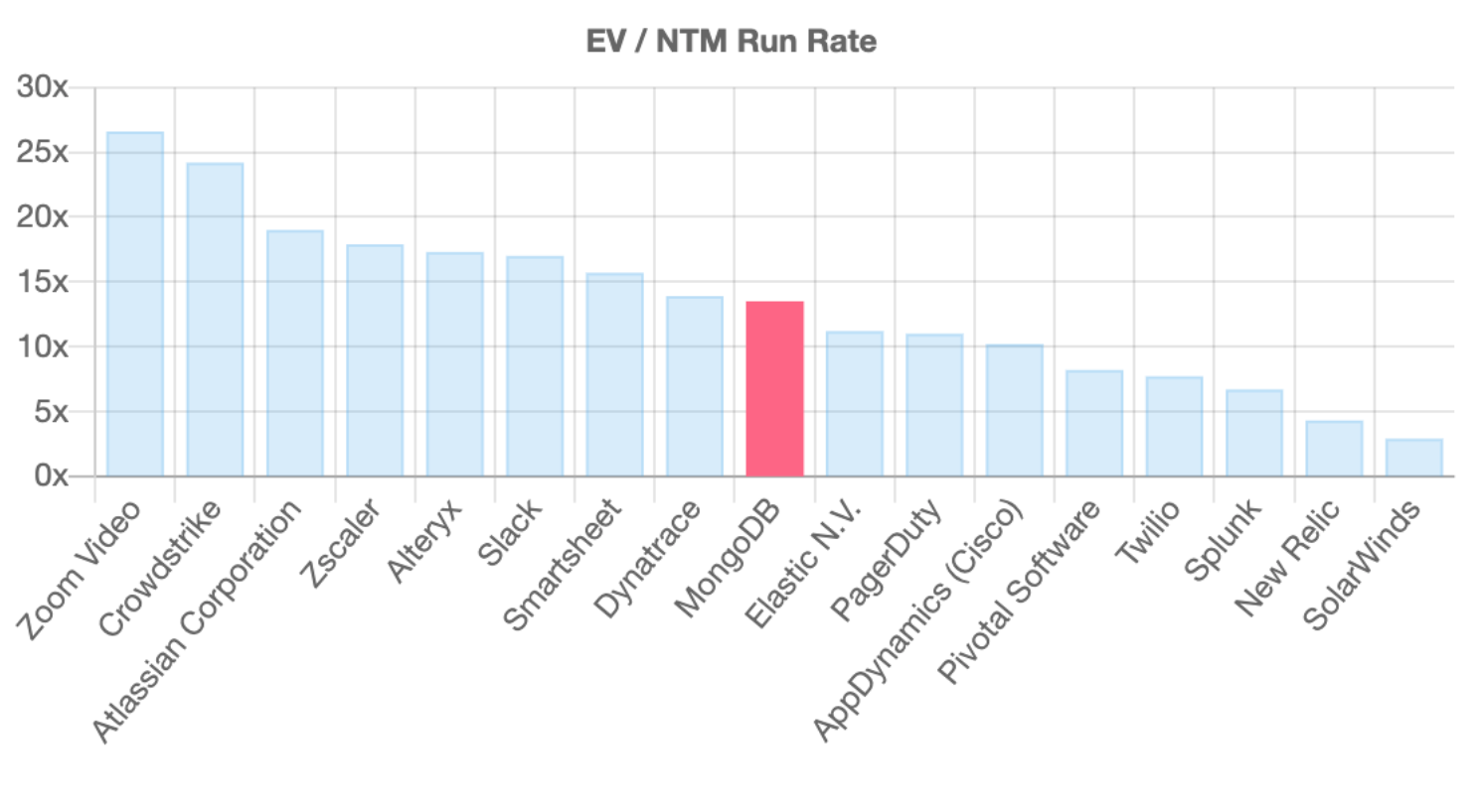 The fastest growing SaaS companies (90%+ YoY) like Zoom, Crowdstrike trade for 20–25x+ NTM ARR and other fast growth companies (40–80% YoY growth) like Zscaler, Alteryx, Twilio, Slack, MongoDB trade between 13–18x NTM ARR.