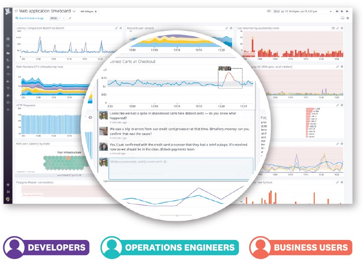 Collaboration: The team at Datadog really emphasize the importance of breaking the traditional silos that Alexis and Olivier dealt with at Wireless Generation between the IT operations and developers. Because Datadog is a single dashboard that integrates across the entire tech stack, developers, IT, business users can investigate collaboratively and have a joint understanding of the health of their application & infrastructure. When there’s a spike in, say, query latency, someone on the IT team can make a comment and notify a developer and share what the IT team is seeing.