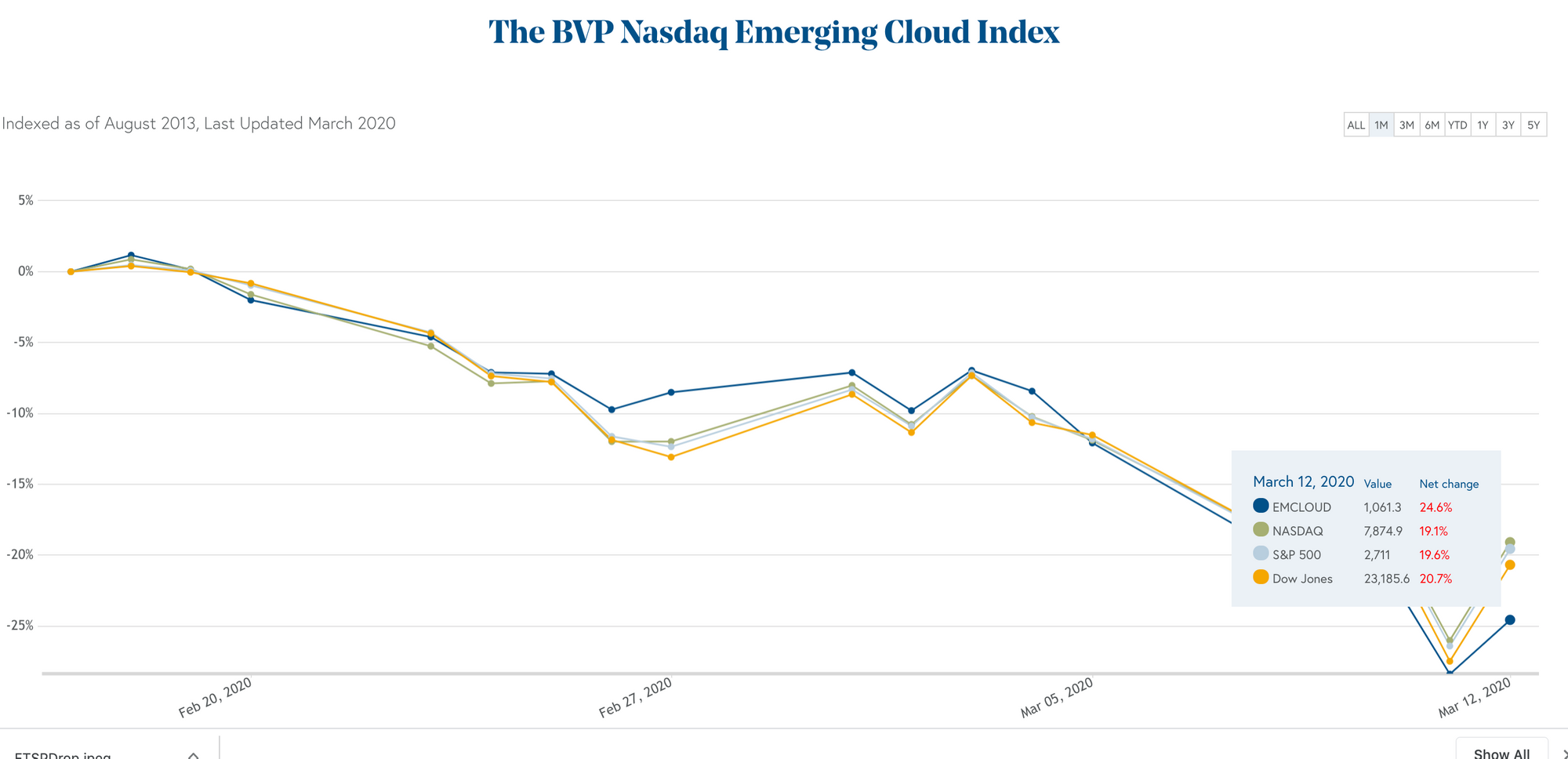 Indexes down: BVP Cloud Index down 25% in the last month and S&P/Dow down ~20%