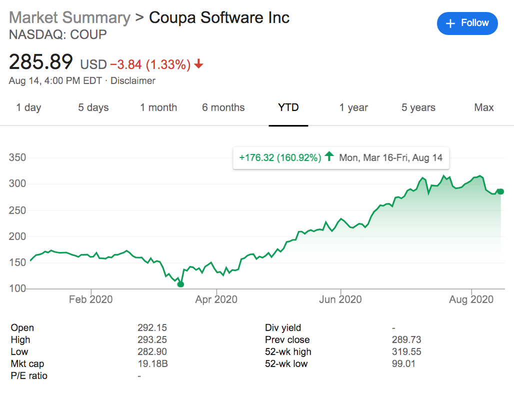 Coupa software is quietly one of the top returning SaaS stocks of 2020. Since its March lows, the stock is up almost 161%, and is up 86% YTD. Despite its outsized returns and it being the 5th most efficient stock in our top 10 SaaS, it remains relatively uncovered contrary to other top B2B SaaS stocks.