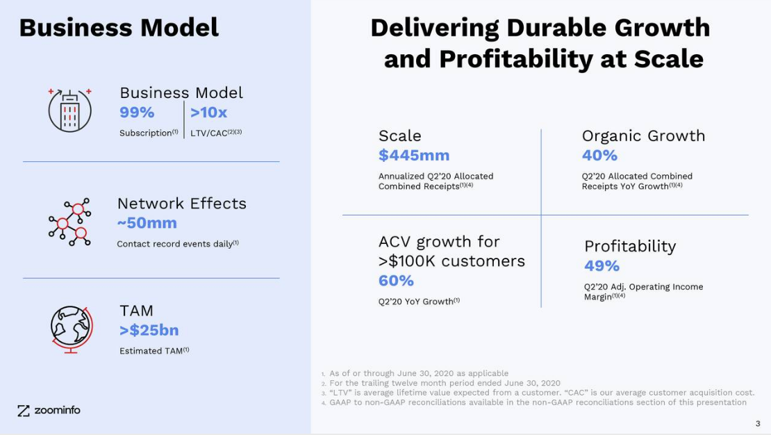 - Success of "land and expand": ZoomInfo now has more than 650 clients spending over $100k/year, representing a 60% growth in ACV for those customers.