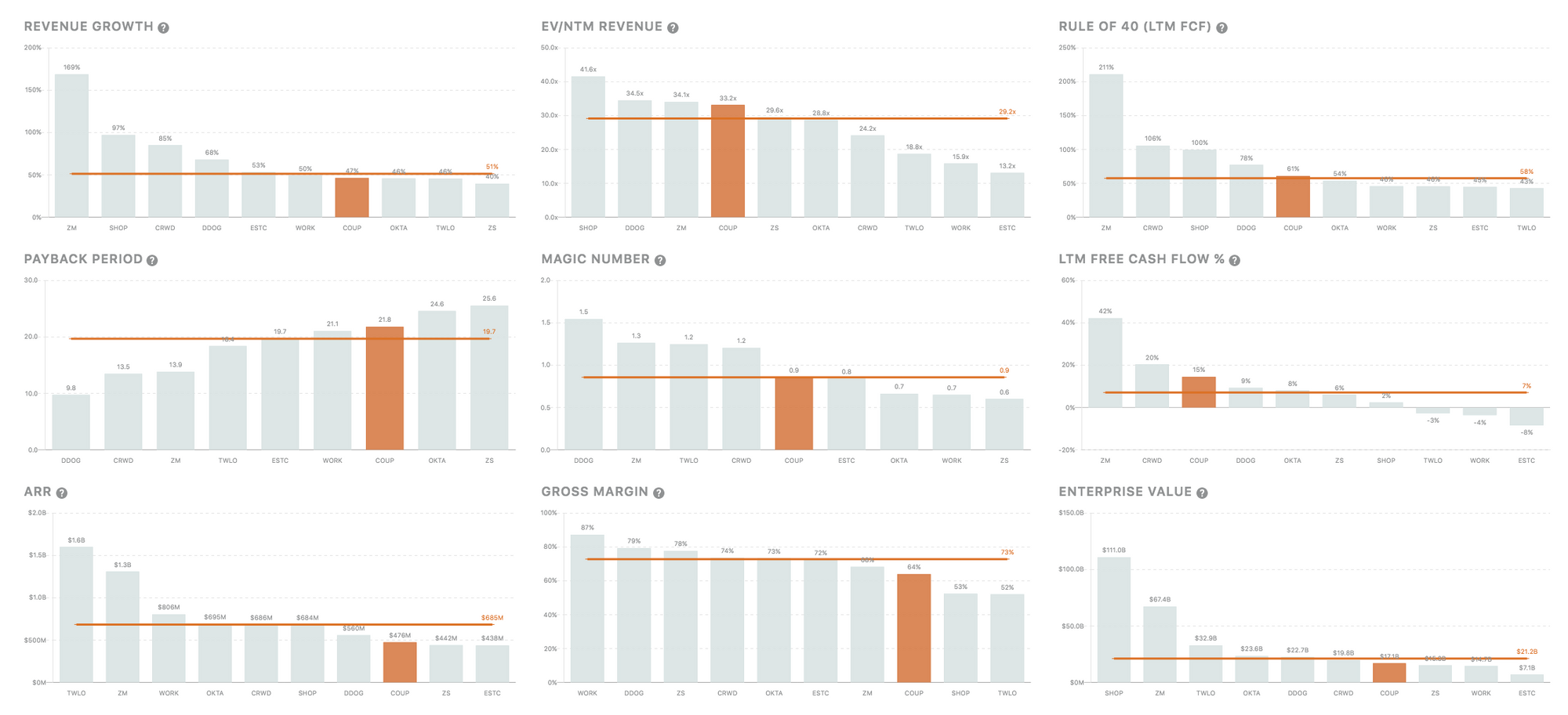 I believe that Coupa remains under-the-radar because on the surface, it appears to more expensive. Its only the 7th fastest growing company (47% revenue growth yoy) in our top 10 SaaS, yet trades at the 4th highest EV/NTM revenue multiple (33.2x). Another reason is growth has been slower than other category-leading cloud industries, as "business spend management" just isn't as cool as cloud endpoint security or cloud infrastructure monitoring.