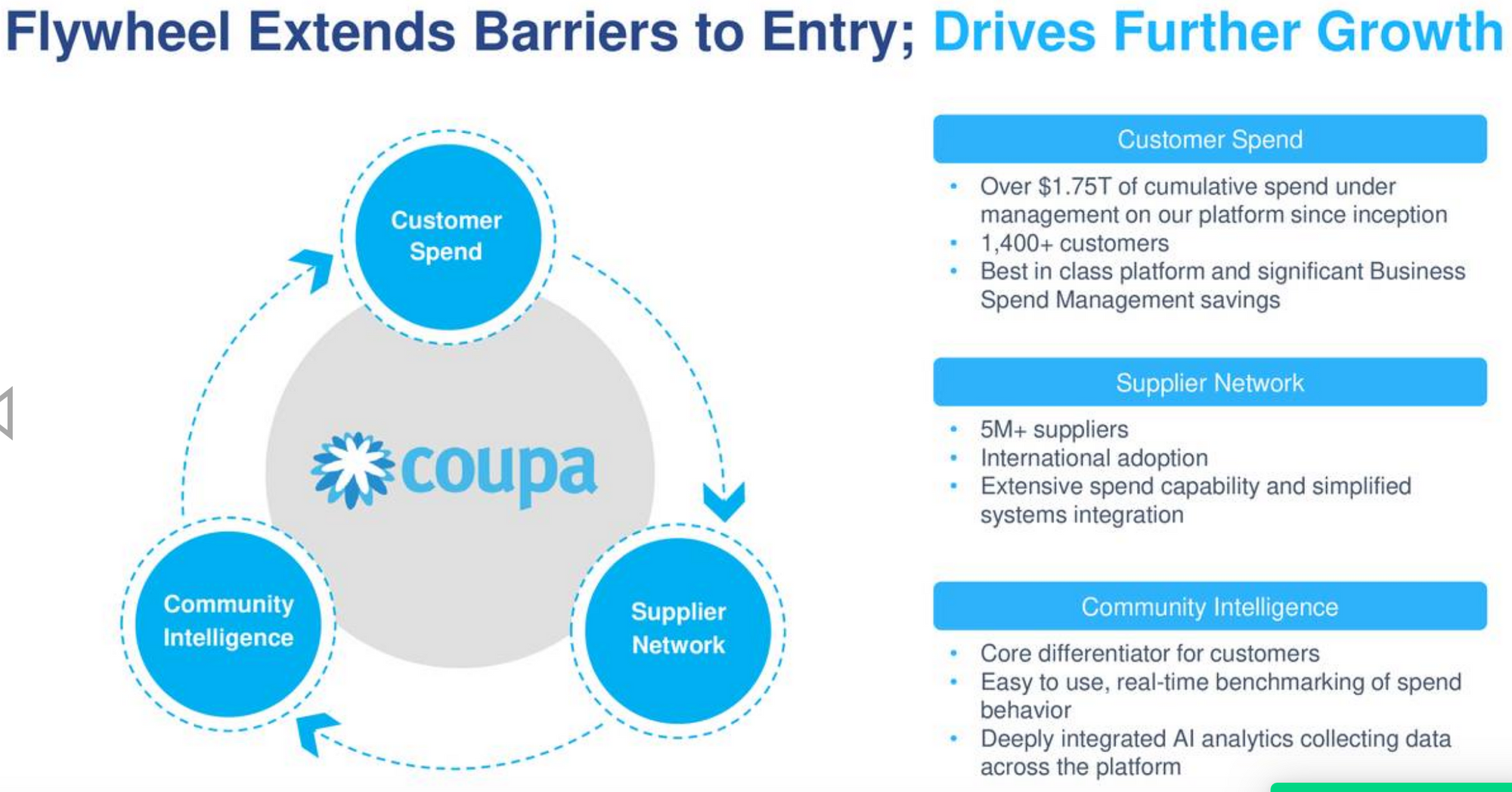 - Reinforcing a positive feedback loop: Coupa can integrate w/ supplier 3rd party systems (Oracle, SAP, others), charges no fees (free) for suppliers, this reduces paper trail & costs and improves operating efficiencies