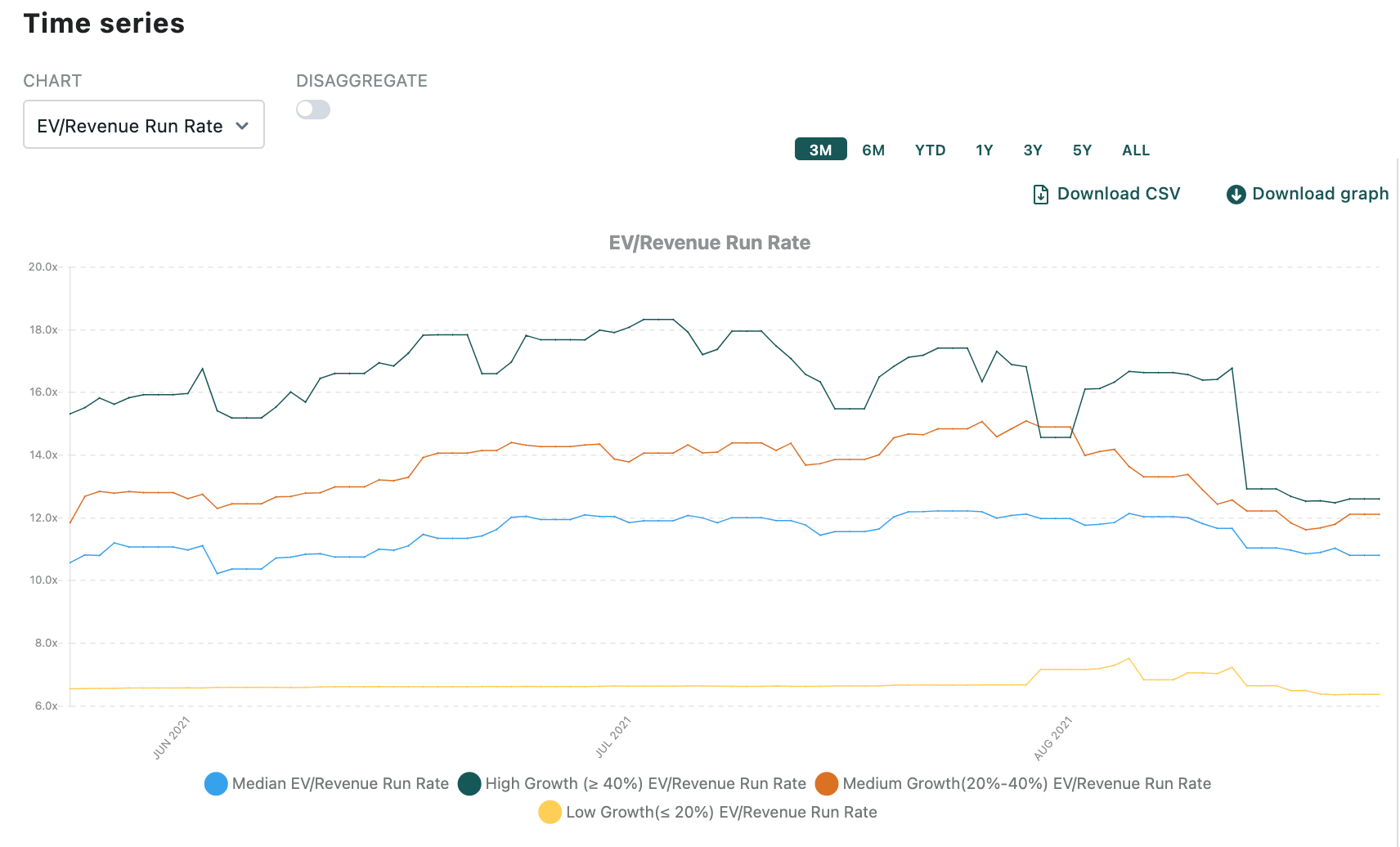- High growth SaaS multiples continue to trend lower: EV/ARRR (Quarter Revenue * 4) has remained relatively constant for the majority of June and July but has fallen sharply since August 12th with high growth companies defined by >40% y/y growth having a 12.6x multiple. It's interesting to note that medium growth and low growth multiples have held steady in the same period, indicating that company earnings for high-growth companies with lofty priced-in expectations have underwhelmed. This is somewhat expected given that companies have to battle COVID-19 quarters that dramatically catalyzed earnings for many best-in-class software names.
