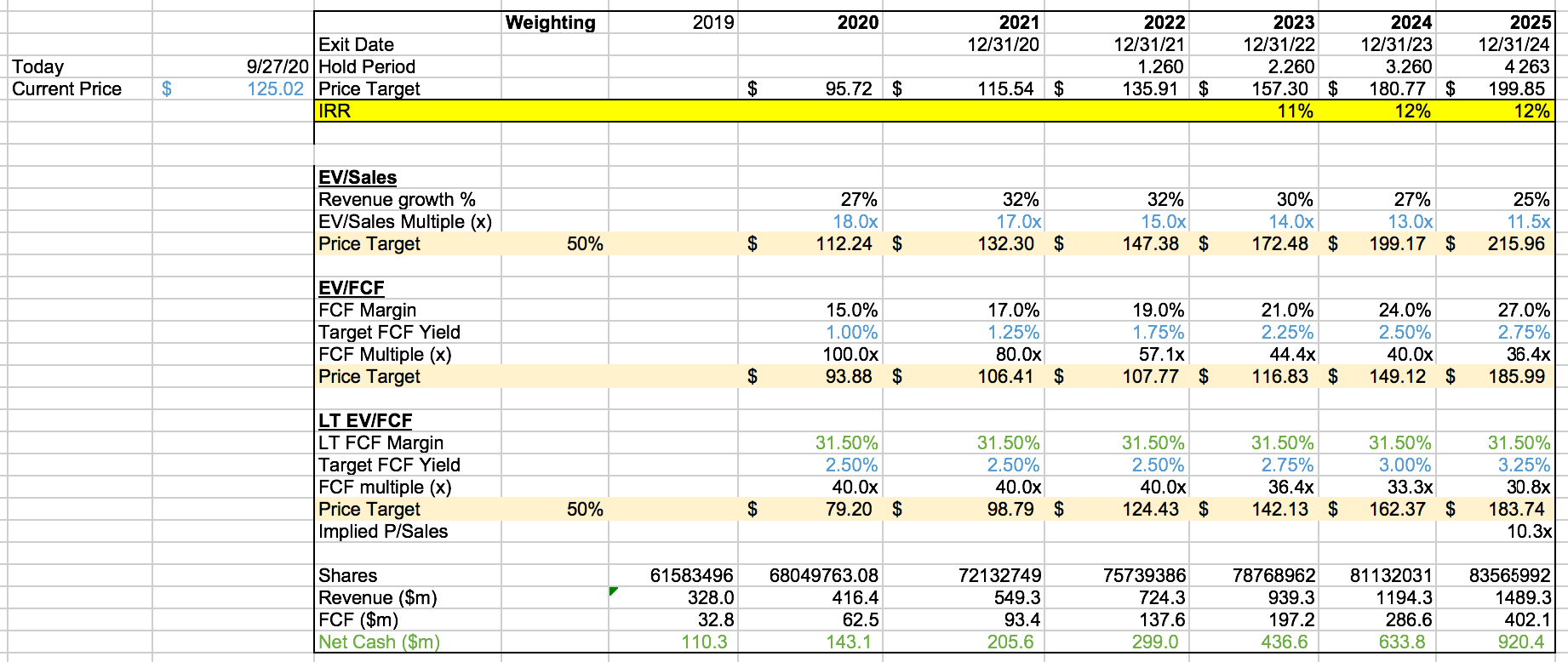 I chose EV/NTM Rev multiples based on comps, with their profit margins growing at those rates and sanity checked with both EV/FCF and LT EV/FCF multiples valuations assuming 31.5% long term FCF margin.