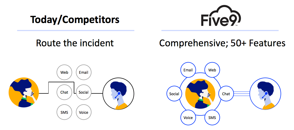 - Higher agent productivity - FIVN empowers agent productivity and effectiveness by allowing agents to handle both inbound & outbound calls and interact with customers across multiple digital engagement channels, including voice, chat, email, web, social media and mobile. This gives agents the ability to switch between media channels through an easy-to-use, unified interface that provides agents with all of the relevant content and tools needed to complete the task at hand.