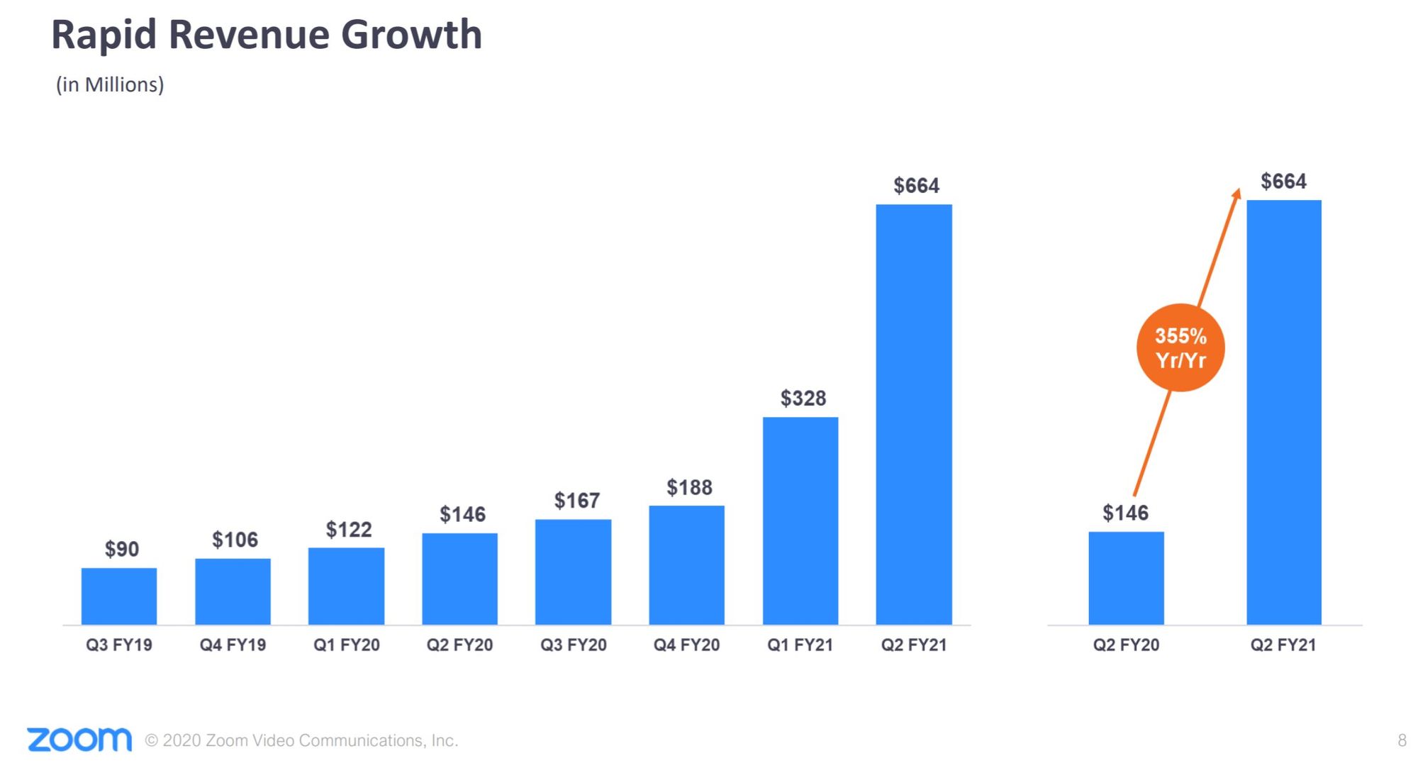 - Revenue: grew 355% to $664M on lower-than-expected churn and exceptional sales execution. ZM added 336M of ARR in the quarter. For the quarter, the year-over-year growth in revenue was primarily due to subscription provided to new customers, which accounted for approximately 81% of the increase, while subscriptions provided to existing customers accounted for approximately 19% of the increase.