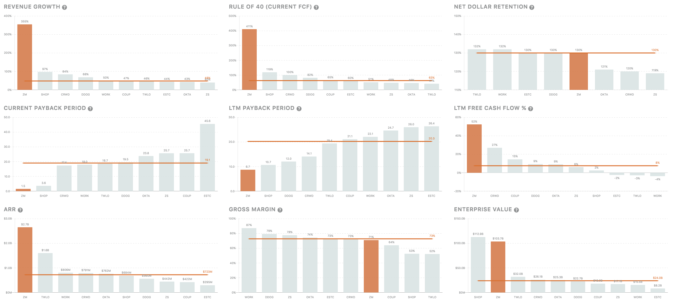 Here, I'm showing Zoom's stock price and EV/NTM multiple benchmarked against a subset of high growth SaaS names.