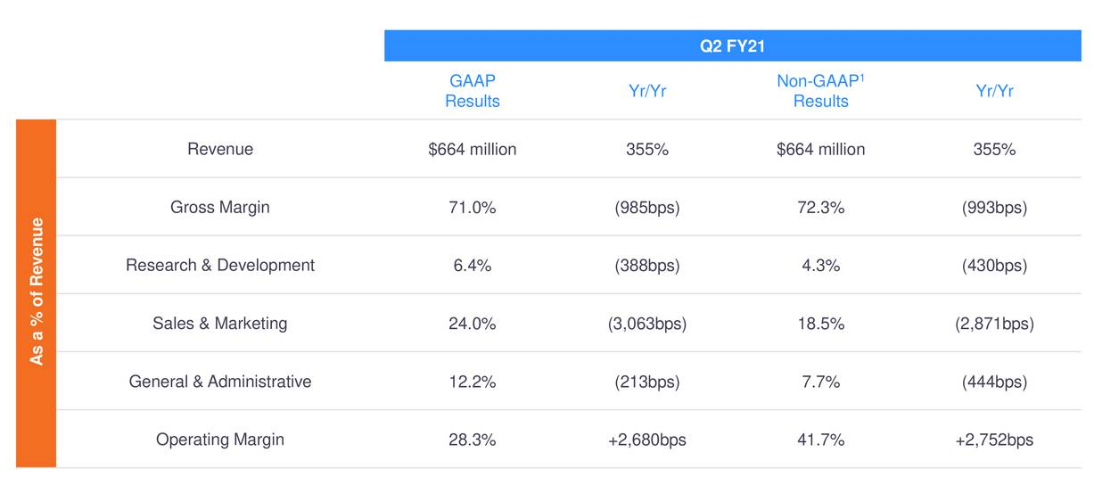 - Remaining performance obligation (RPO): 1.4B in RPO (+209% yoy), deferred revenue grew to 743M (+309% yoy). Management expects to recognize ~72% ($1B) of the total RPO as revenue over the next 12 months, compared to 62% ($285M) in Q2FY20. This indicates a shift in their renewal seasonality, which was historically weighted toward Q2 and Q4 and has now shifted to Q1 due to the strength of last quarter's performance.