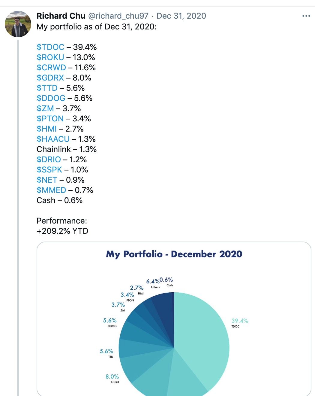 Richard Chu (@richard_chu97) is a consultant turned growth investor and posts his ideas and portfolio readily on Twitter. Here's an example from a recent tweet: