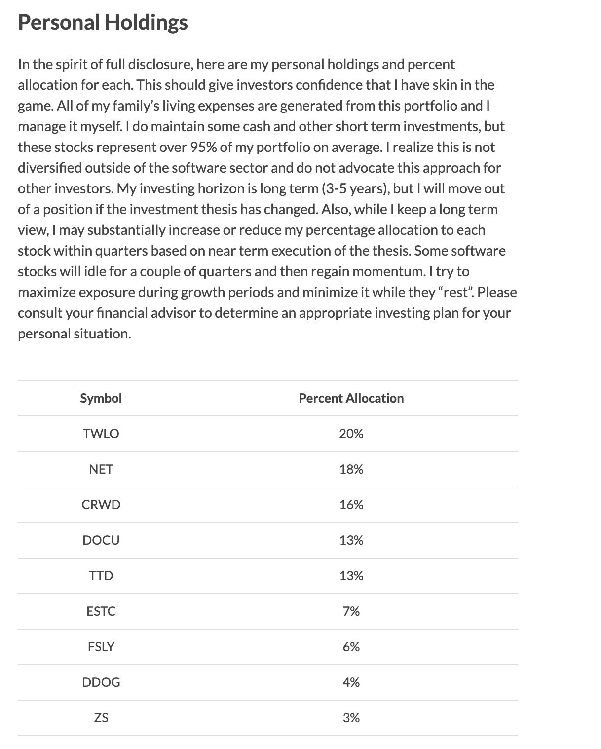 Peter Offringa at Software Investing Stack (@StackInvesting) similarly shares his rationales behind each of his investments and shares his personal portfolio publicly. Peter regularly goes through product and financial updates for each of his holdings like this teardown of Twilio's Q3'2020 earnings