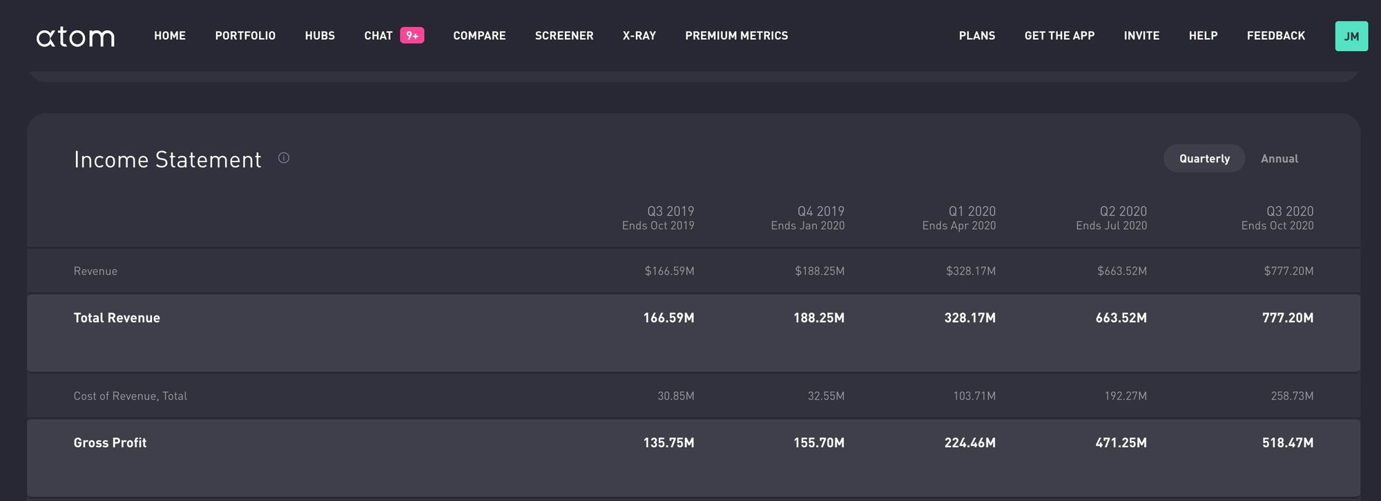 - Atom Finance: Atom Finance also provides really slick tools to dive more deeply into a given company with historical financials, quarterly reports, historical consensus estimates, and even generate a simple model with their “Sandbox” feature.