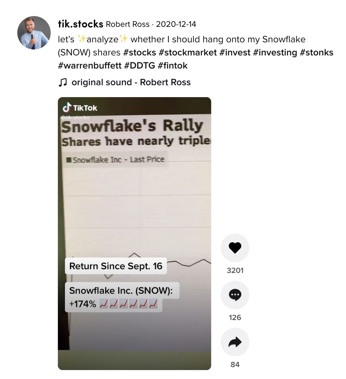 Implications: Founders looking to market their products on Tik Tok and Twitter will need to find a balance of providing educational content that is also punchy and entertaining. For example, Robert Ross, an equity research analyst, does an awesome job talking through stocks like Tesla, Snowflake, Palantir and sharing the high level takeaways from his models while being very entertaining ("let's analyze!").