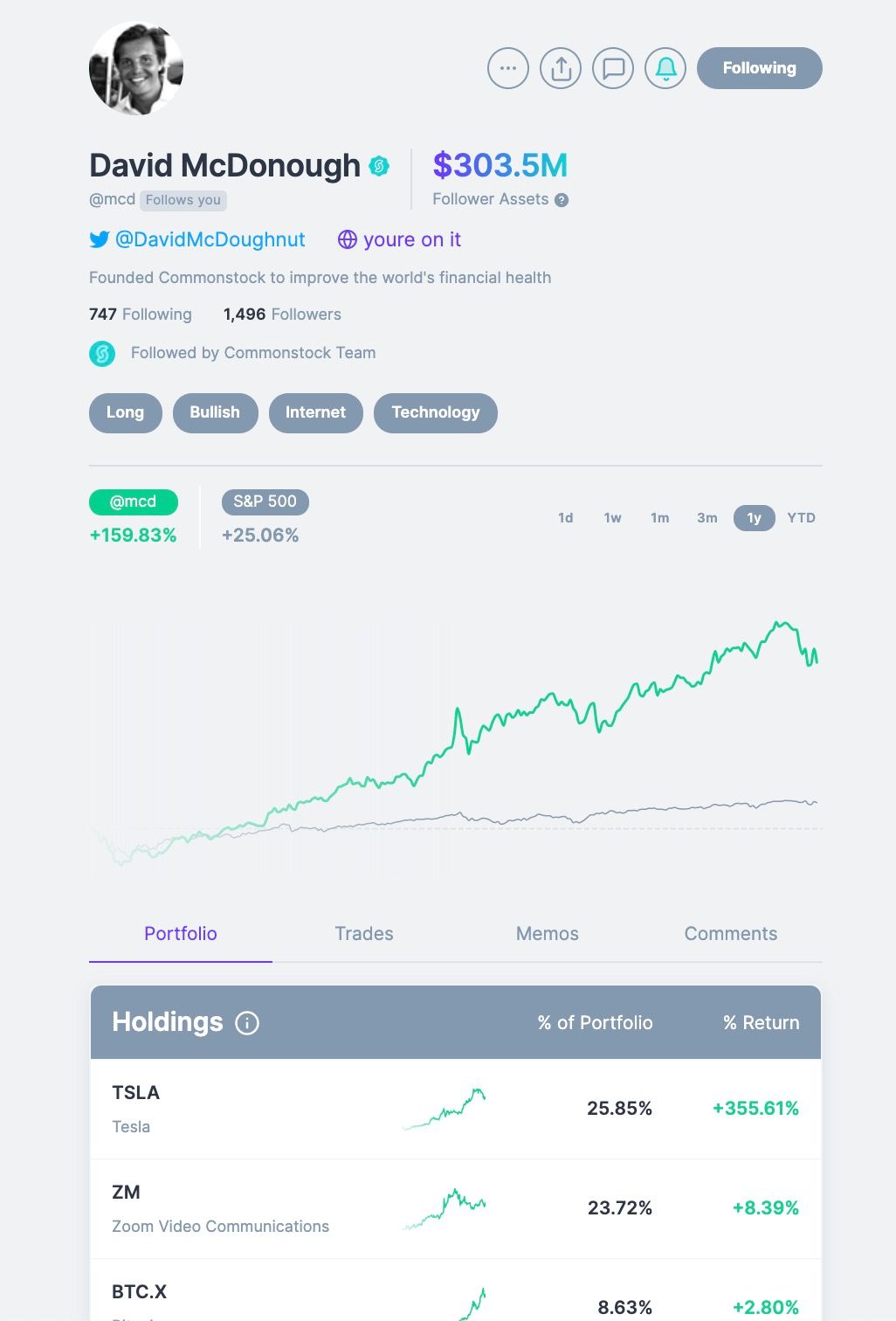 Commonstock is super fascinating in that by default users are sharing their returns and portfolio publicly so investors can choose to follow influencers that they trust or have the best returns. Commonstock automates what influencers are doing manually themselves of tracking the portfolio, posting it on Twitter and sharing their rationale behind each trade.