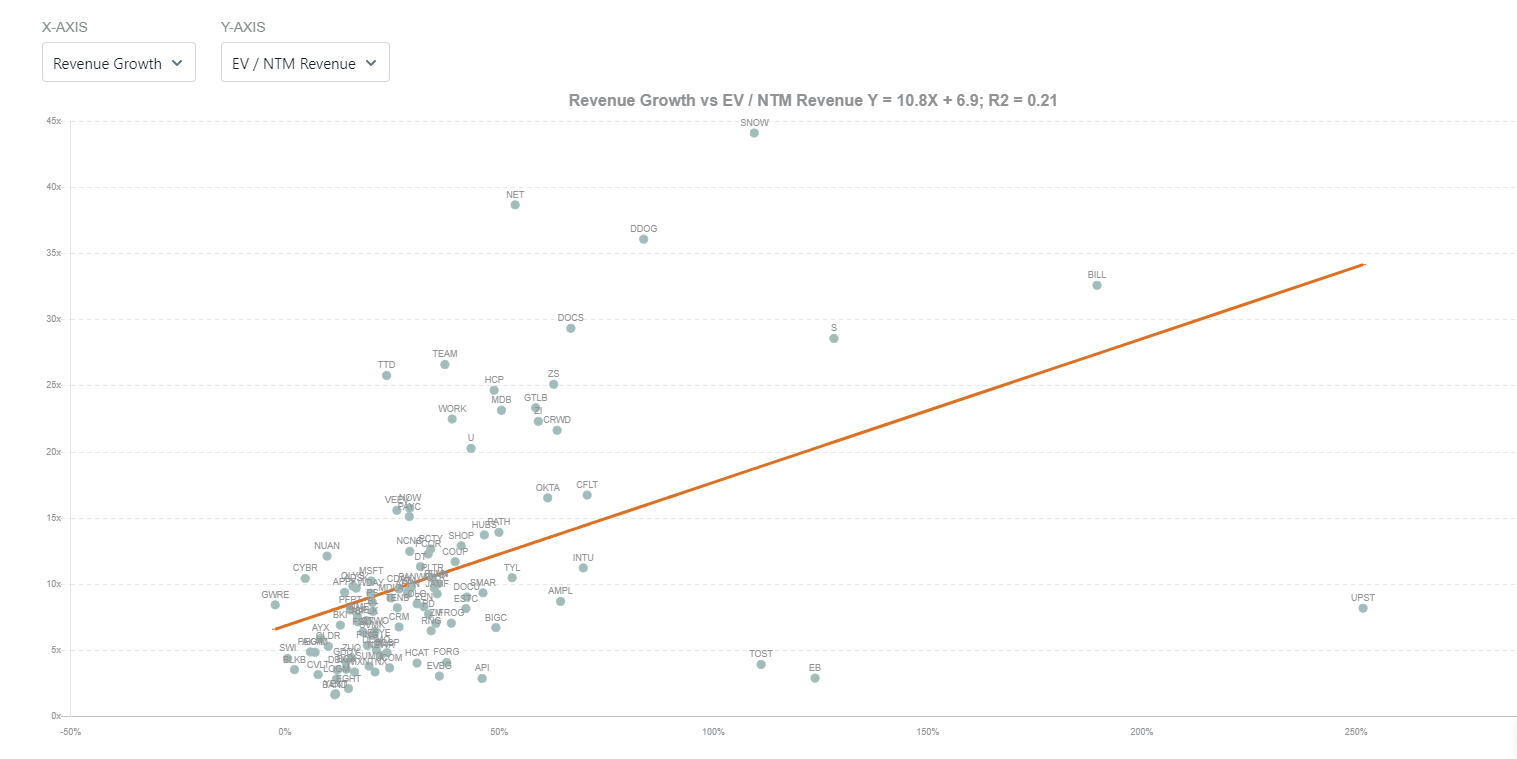 - Bull view: Best-in-class SaaS businesses are trading at rational valuations and the market is undermining long-term free cash flows. Current price action is non-fundamental as SaaS companies continue to execute consistent 30%+ YoY revenue growth.