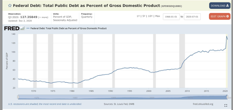 - Investors are worried that central banks are monetizing debt and inflation may come in the coming years: US M2 is up 24% YoY from October ‘19 to October ‘20 and the US deficit grew to $3.1T because of the government spending in response to COVID. US Debt to GPD grew to 131% which is the highest it's ever been historically