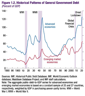 - While government debt was climbing even prior to 2020, emerging market and advanced economy debt as a percentage of GDP are climbing due to the “Great Lockdown” from COVID-19