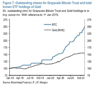 - A JP Morgan analyst pointed out while there was a modest outflow from gold ETFs starting in October 2020, there was an inflow into Grayscale Bitcoin Trust which is an investment vehicle working in accordance with the SEC reporting rules and popular among family offices. This suggests some institutions and family offices are investing in Bitcoin instead of gold.