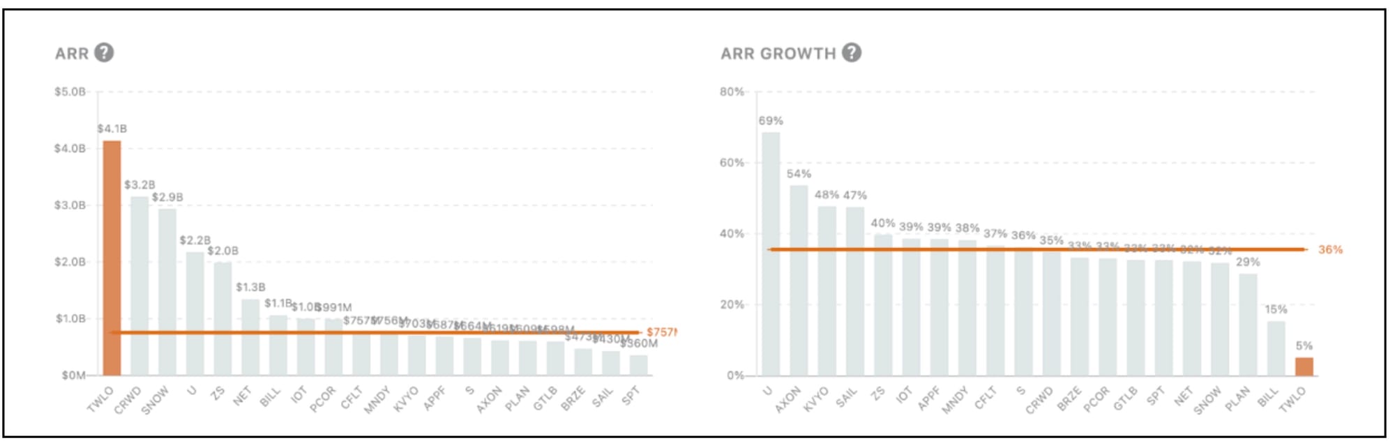 - Third, Twilio’s dollar net-based expansion rate is down near 100% and the lowest among “Top 10 SaaS”, an indication that Twilio is struggling to cross-sell among its existing customer base. While Twilio sees its Data & Applications portion of the business with the most opportunity to cross-sell, the fact that that portion of the business is both smaller and has seen less growth helps explain the low expansion rate.