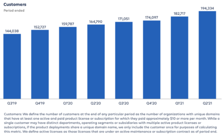 - Customers – Atlassian has over 185,000 customers today. Atlassian states that there are 800,000 companies globally with technical teams large enough to be Atlassian customers as well as 2 million companies with 10 knowledge workers or more.