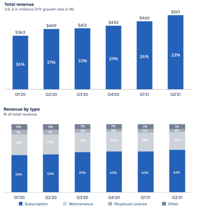 - Revenue grew 23% YoY to $501 million while SaaS revenue grew 36% YoY and maintence revenue grew 12% YoY.