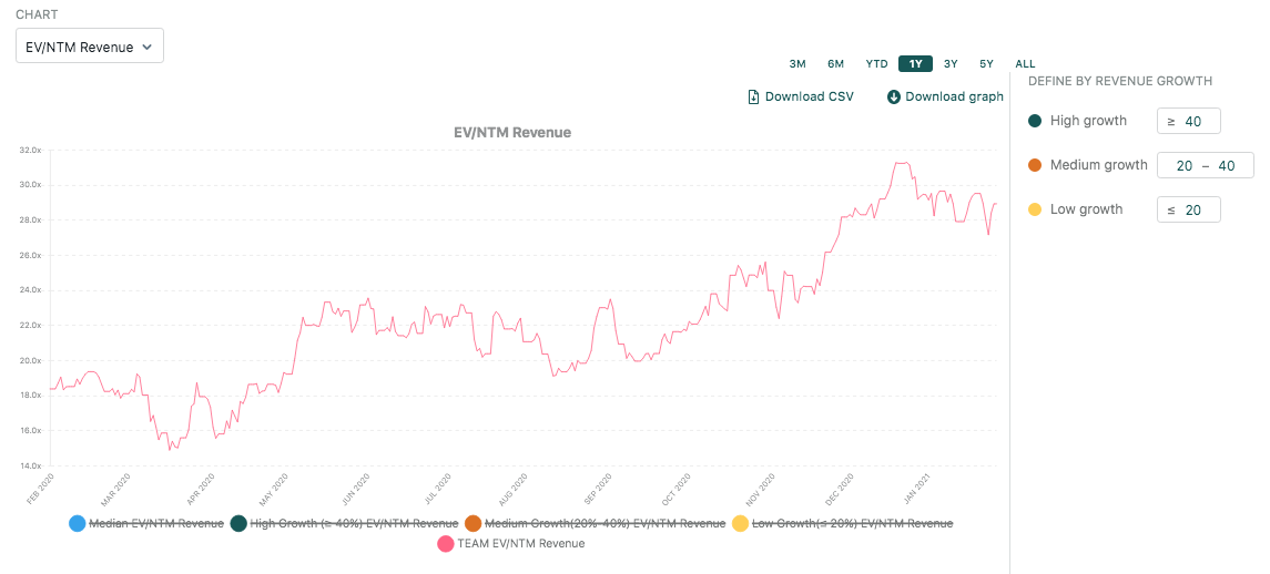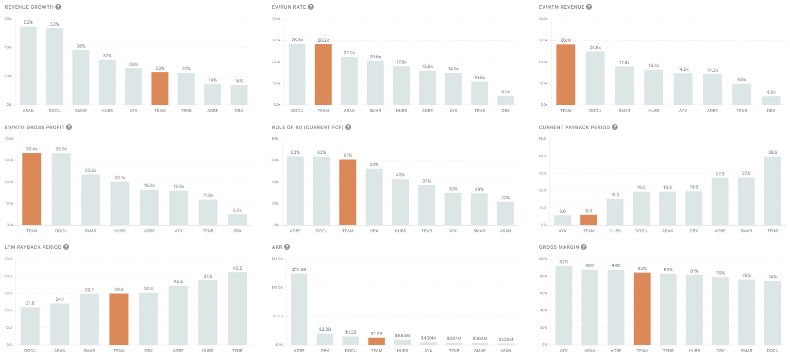 Despite only growing top-line at a modest 23% YoY, Atlassian currently trades at 28.1x NTM revenues because investors love the competition positioning and its highly efficient sales motion. Atlassian boasts an LTM FCF margin of 27%.