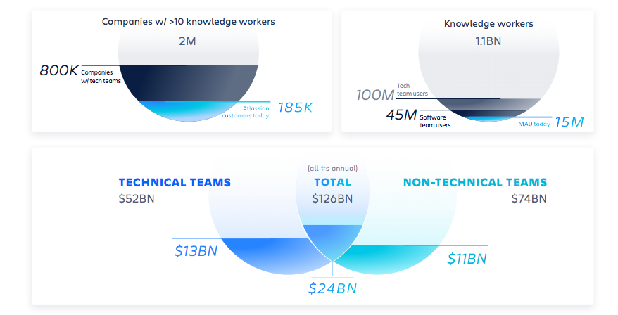 - TAM - Atlassian reports that the annual global technical and knowledge worker markets is worth $126 billion in annual revenue according to IDC. This is composed of $52 billion for technical teams and $74 billion for non-technical teams. Both markets are growing 9% per year, several times the rate of global GDP.