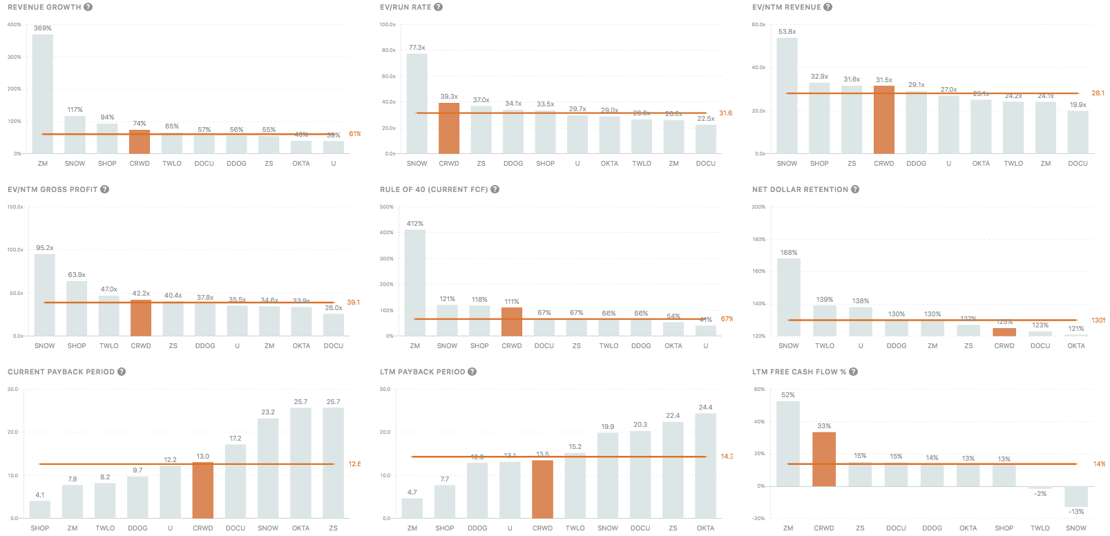 Crowdstrike is $1.05B ARR growing 75% YoY and 16% QoQ, which makes it the 2nd fastest growing SaaS company among all B2B SaaS companies (behind Zoom). Crowdstrike posted 37% FCF margins in the most recent quarter with $1B+ cash on its balance sheet. CRWD has good net retention with 125% NDR and 98% Gross Retention. CRWD trades for 39x ARR and what we estimate to be roughly 25-27x NTM ARR. The business has benefited dramatically from COVID-19 as companies are scrambling to secure endpoints for WFH and legacy providers are being disrupted by Crowdstrike's superior product. Crowdstrike has shown to be incredibly opportunistic during this period, amidst notable security attacks, and is becoming the clear dominant platform in this space through product execution and acquisition.