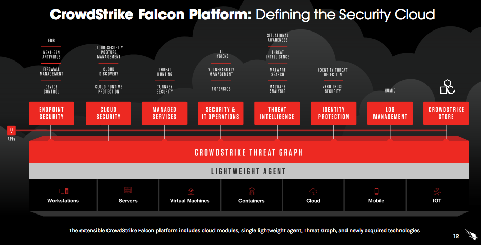 Their Falcon Platform is a SaaS based security offering for next-generation endpoint protection that detects, prevents, and responds to attacks. The company's cloud & AI approach is in contrast to on-prem endpoint security solutions or primarily rules-based and signature-based anti-virus companies like Symantec and McAfee.