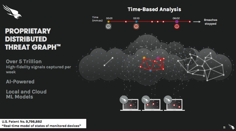 Falcon, Crowdstrike's platform, is a single lightweight agent that installs on the customer's endpoint that feeds data into Crowdstrike's cloud-based database called Threat Graph. By leveraging the cloud, Falcon is able to continually collect, process, and analyze threats across all customer's endpoints in real-time. As there's more data that's fed into Falcon, there is more data to train Crowdstrike's AI models with, increasing the overall efficacy of Falcon.