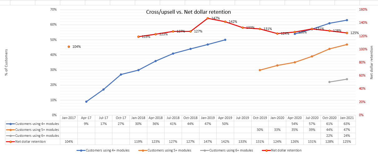 Interesting to note that management only recently broke out the % of customers using 6+ modules last quarter, and % of customers using 5+ models a little over a year ago.