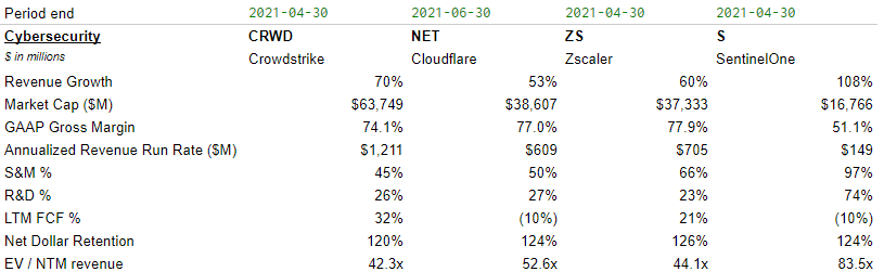 - Crowdstrike leads cybersecurity by growth and size, offering a cloud & AI-based SaaS platform that detects, prevents, and responds to cyber-attacks on customer endpoints. CRWD is followed by Cloudflare, ZScaler, and SentinelOne, which are a mix of players offering endpoint / web security solutions.