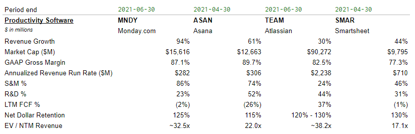 - Asana also went public late last year, another work management software provider, trailing behind Monday.com's rapid growth. Multiples in productivity software are mixed (yet still in-line with high-growth SaaS), with investors paying a premium for MNDY's best-in-class growth rates and TEAM's profitability.