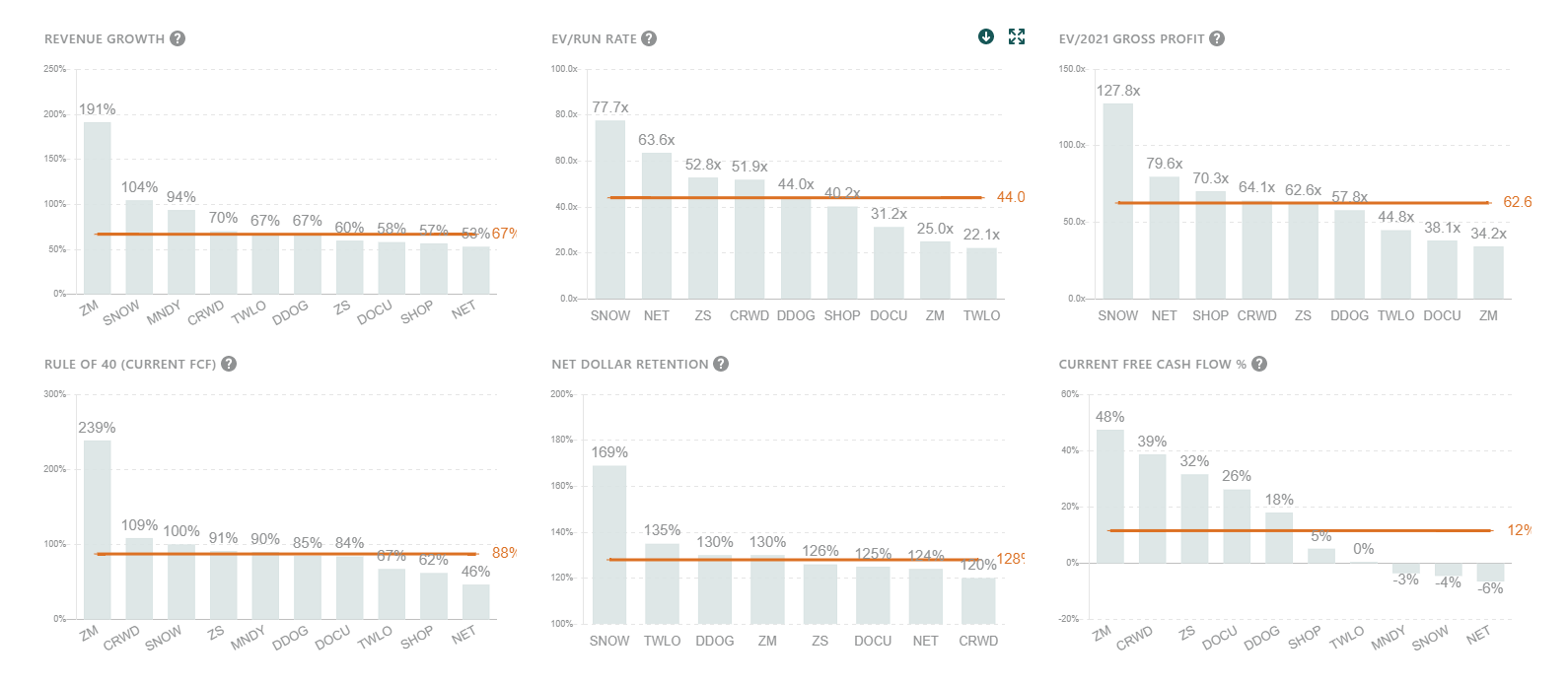 - Note the lack of analyst NTM revenue estimates for MNDY/TEAM, which I instead approximated based on management guidance. TEAM also does not report NDR, but noted a 121% cloud net expansion rate in their FY21 investor day. For medium/large-size customers it was 130%.