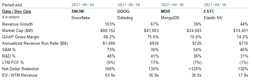 - Snowflake, the leading public cloud-based data warehousing platform, continues to trade at exorbitant multiples (for reason) with its best-in-class metrics, followed by open-source relational database MongoDB. Datadog and ElasticNV lead observability, with multiples in range of high-growth SaaS.