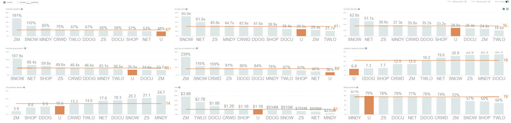 Although Unity is posting consistent +30% top-line growth YoY (their 11th consecutive quarter), slightly on the lower end relative to top 10 SaaS, U trades at 28.0x NTM EV/Rev. Investors believe in the position that U has established with its core products, and see value in paying a premium for the long-term story of expansion into AR/VR + enormous applications outside of gaming.