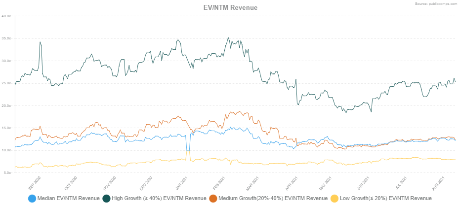 - SaaS multiples gradually rising ahead of a big earnings month: EV/NTM revenue multiples for high growth companies (defined by >40% YoY rev growth) floated upwards to a 25.5x multiple, at levels well under highs we saw at ~35.0x at the beginning of 2021.